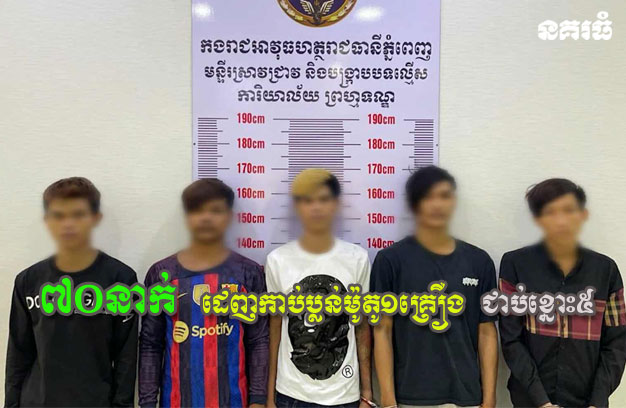 ភ្នំពេញ ៖ ក្មេងទំនើង ១ក្រុមធំ មានគ្នាប្រមាណ៧០នាក់ ជិះម៉ូតូប្រមាណ ៥០គ្រឿង ប្រដាប់ដោយដុំថ្ម បំពង់ទីប និងដាវកាំបិត បានធ្វើសកម្មភាពដេញកាប់យុវជន ១ក្រុម ប្លន់ម៉ូតូ ១គ្រឿង បានសម្រេច លុះក្រោយមកត្រូវបានកម្លាំងជំនាញអាវុធហត្ថស្រាវជ្រាវឃាត់ខ្លួនបានជាបន្តបន្ទាប់ ចំនួន៥នាក់ នាំយកមកចាត់ការតាមច្បាប់។