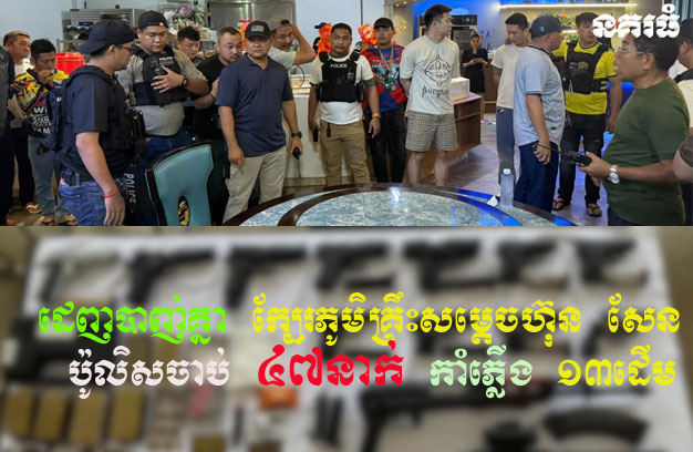 ខេត្តព្រះសីហនុ ៖ ស្នងការនគរបាលខេត្តព្រះសីហនុ បង្ក្រាបបានករណីកាន់កាប់ រក្សាទុក និងប្រើប្រាស់អាវុធខុសច្បាប់ ចំនួន១៣ដើម និងឃាត់ខ្លួនជនសង្ស័យជាជនជាតិចិន ៤៧នាក់ បន្ទាប់ពីមានករណីផ្ទុះអាវុធ មួយកើតឡើង បង្កដោយជនជាតិចិន ចំនួន២ក្រុម ប្រដាប់ដោយអាវុធវែងខ្លី ស្ទើរគ្រប់ដៃ ដេញបាញ់គ្នា។