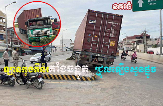 ភ្នំពេញ ៖ រថយន្តកុងតឺន័រ ១គ្រឿង ខណៈកំពុងបើកបរលើដងផ្លូវសុខៗ ស្រាប់តែគាំងចង្កូតបញ្ជាលែងបាន ធ្វើឱ្យជ្រុលបុកឡើងទៅលើសួនពុះចែកទ្រូងផ្លូវ ជិតរង្វង់មូលគល់ស្ពានអាកាសមហាវិថីស៊ីជីនពីង ទាំងកំរោល សំណាងល្អ មិនបានបង្កឱ្យអ្នកដទៃរងរបួសឡើយ គ្រាន់តែខូចខាតសួនពុះចែកទ្រូងផ្លូវ។