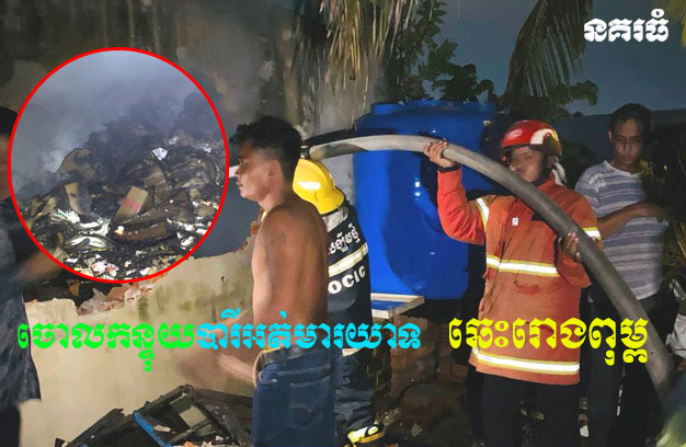 ភ្នំពេញ ៖ រោងបោះពុម្ពក្រដាសសែន មួយកន្លែង ត្រូវបានអគ្គិភ័យឆាបឆេះយ៉ាងសន្ធោសន្ធៅ ដោយមូលហេតុផ្តើមចេញពីការបោះចោលកន្ទុយបារី អត់មារយាទ ខ្វះការប្រុងប្រយ័ត្ន ធ្វើឱ្យកើតមានអគ្គិភ័យ បង្កការភ្ញាក់ផ្អើលដល់ប្រជាពលរដ្ឋនិងសមត្ថកិច្ច ទាក់ទងហៅរថយន្តពន្លត់ អគ្គិភ័យចេញជួយអន្តរាគមន៍បាញ់ទឹកពន្លត់ភ្លាមៗ ដោយប្រើប្រាស់ទឹកអស់ចំនួន ៧ឡាន។