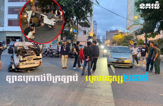 ភ្នំពេញ ៖ បុរសម្នាក់ បានបើករថយន្ត ១គ្រឿង ក្នុងល្បឿនលឿន រួចជ្រុលទៅបុកម៉ូតូកង់បី ១គ្រឿង ពេញទំហឹង បណ្តាលឱ្យម៉ូតូកង់បី ក្រឡាប់ផ្ងារជើងទ្រមេឃ និងបណ្តាលឱ្យអ្នកជិះកង់បី ចំនួន២នាក់ រងរបួសធ្ងន់-ស្រាល និងត្រូវបានដឹកបញ្ជូនទៅសង្គ្រោះភ្លាមៗ។