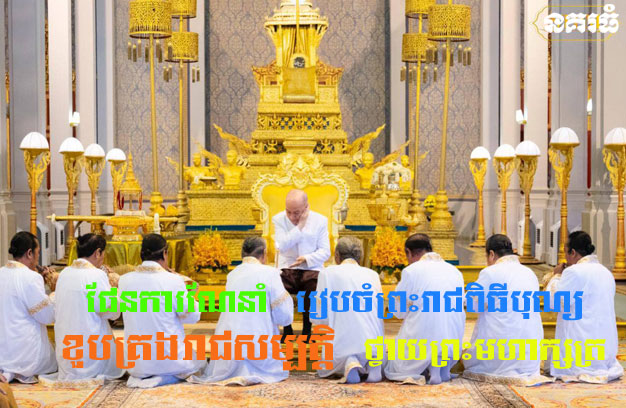 ក្រសួងធម្មការនិងសាសនា ៖ ណែនាំមន្ទីរធម្មការនិងសាសនា រាជធានី ខេត្ត រម្លឹកគ្រប់វត្តអារាម ឱ្យរៀបចំព្រះរាជពិធីគ្រងព្រះបរមសិរីរាជសម្បត្តិ ថ្វាយព្រះរាជកុសល និងព្រះរាជសព្ទសាធុការពរ ថ្វាយព្រះករុណាជាអម្ចាស់ជីវិតលើត្បូង ព្រះមហាក្សត្រ នៃព្រះរាជាណាចក្រកម្ពុជា ជាទីគោរពសក្ការៈដ៏ខ្ពង់ខ្ពស់បំផុត ដោយរៀបចំតាំងព្រះបរមឆាយាល័ក្ខណ៍ ដោយមានតុបតែងលម្អបំភ្លឺភ្លើងពណ៌ លើកទង់ជាតិ ទង់សាសនា ទង់ព្រះមហា ក្សត្រ បដាពាក្យស្លោកឱ្យ បានសមរម្យ។