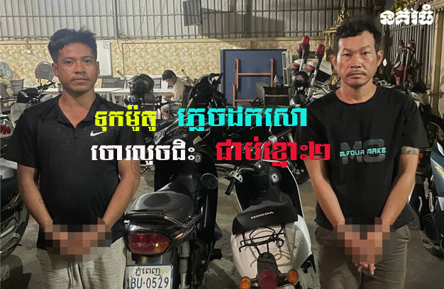 ជនសង្ស័យទាំង២នាក់ ដែលត្រូវសមត្ថកិច្ចឃាត់ខ្លួន ទី១-ឈ្មោះគៀង ចៅសំ ហៅជ័យ ភេទប្រុស អាយុ៣២ឆ្នាំ មុខរបរមិនពិតប្រាកដ ស្នាក់នៅបន្ទប់ជួល ភូមិប្រការ សង្កាត់ព្រៃស ខណ្ឌដង្កោ និងទី២-ឈ្មោះម៉ែន វិចិត្រ ភេទប្រុស អាយុ៣៤ឆ្នាំ មុខរបរមិនពិតប្រាកដ មានលំនៅ សង្កាត់ផ្សារដើមគ ខណ្ឌទួលគោក។ ចំពោះវត្ថុតាងចាប់យក រួមមាន ១-ម៉ូតូម៉ាកហុងដា ឌ្រីម សេ១២៥ ពណ៌ខ្មៅ សេរីឆ្នាំ២០១៣ ពាក់ស្លាកលេខ ភ្នំពេញ 1BU-0529 ជាជនរងគ្រោះឈ្មោះហួន ចន្ធី ភេទប្រុស អាយុ៤១ឆ្នាំ មុខរបរលក់ដូរ មានលំនៅ ផ្ទះលេខ A08 ផ្លូវ៥០ម៉ែត្រ ស្ថិតនៅភូមិប្រការ សង្កាត់ព្រៃស ខណ្ឌដង្កោ។ ២-ម៉ូតូម៉ាក Today ពណ៌ស ពាក់ស្លាកលេខ ភ្នំពេញ 1GG- 0993  ចំនួន១គ្រឿង (មធ្យោបាយដែលជនសង្ស័យជិះធ្វើសកម្មភាព)។ ៣-ទូរស័ព្ទដៃម៉ាក OPPO ពណ៌ខ្មៅ ចំនួន១គ្រឿង (ជារបស់ជនសង្ស័យ)។