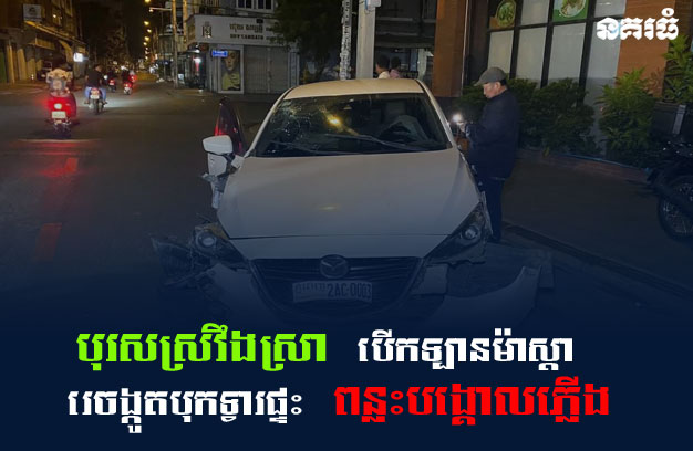 ភ្នំពេញ ៖ បុរសម្នាក់ សង្ស័យស្រវឹងស្រា បានបើករថយន្ដ Mazda បុកជាមួយម៉ូតូកង់បី មួយគ្រឿង បណ្ដាល ឲ្យជ្រុល ទៅបុកទ្វារផ្ទះប្រជាពលរដ្ឋ រួចបន្តទៅបុកបង្គោលភ្លើងបំភ្លឺផ្លូវ បណ្ដាលឲ្យបាក់រលំ ចំនួនមួយ ដើមទៀត ។