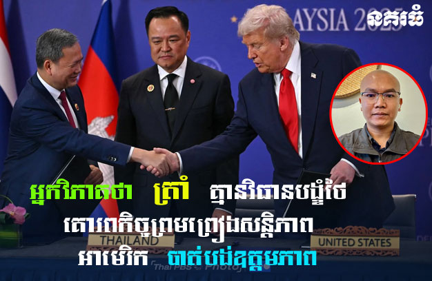 ភ្នំពេញ ៖ អ្នកវិភាគ បានលើកឡើងថា ការដែលប្រទេសថៃ មិនគោរពកិច្ចព្រមព្រៀងសន្តិភាពក្រុងកូឡាឡាំពួរ ដែលមានលោកប្រធានណាធិបតី ដូណាល់ ត្រាំ នៃសហរដ្ឋអាមេរិក ជាសាក្សី ហើយនៅតែបន្តឃុំខ្លួនកងទ័ពកម្ពុជា ១៨នាក់ និងបន្តសកម្មភារំលោភបំពានអធិបតេយ្យនិងបូរណភាពទឹកដីកម្ពុជា យ៉ាងគឃ្លើននោះបើសិន ជាលោកប្រធានាធិបតី ដូណាល់ ត្រាំ គ្មានវិធានបង្ខំថៃ ឲ្យគោរពកិច្ចព្រមព្រៀងសន្តិភាពនោះទេ នឹងធ្វើឲ្យសហ រដ្ឋអាមេរិក បាត់បង់ឧត្ដមភាពនិងការជឿទុកចិត្តពីសំណាក់ប្រទេសនានា រួមទាំងសម្ព័ន្ធមិត្តរបស់ខ្លួនមួយចំនួន ។