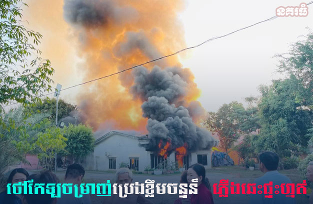 ខេត្តកំពង់ស្ពឺ ៖ ផ្ទះមួយខ្នង ជារបស់ថៅកែឡចម្រាញ់ប្រេងខ្លឹមចន្ទន៍ ត្រូវបានអគ្គិភ័យលេបត្របាក់អស់គ្មានសល់ កាលពីវេលាម៉ោង៥និង១០នាទីល្ងាច ថ្ងៃទី១៩ ខែធ្នូ ឆ្នាំ២០២៥ នៅចំណុចក្នុងភូមិព្រៃស្លឹក សង្កាត់ច្បារមន ក្រុងច្បារមន។