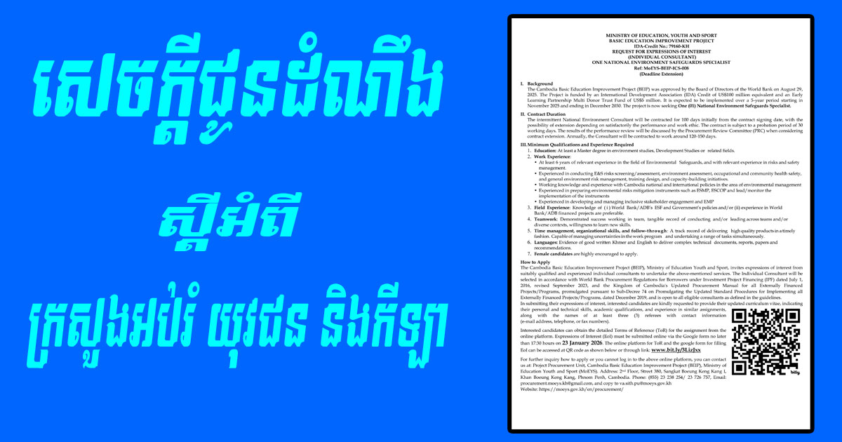 Homeព័ត៌មានជាតិសេចក្តីជូនដំណឹង ស្តីអំពី ក្រសួងអប់រំ យុវជន និងកីឡា ព័ត៌មានជាតិ សេចក្តីជូនដំណឹង ស្តីអំពី ក្រសួងអប់រំ យុវជន និងកីឡា By Davin January 16, 2026 0 0 Share FacebookTwitterPinterestWhatsApp RELATED ARTICLES ព័ត៌មានជាតិ សេចក្តីជូនដំណឹង ស្តីអំពី ក្រសួងអប់រំ យុវជន និងកីឡា February 9, 2026 ព័ត៌មានជាតិ សេចក្តីជូនដំណឹង ស្តីអំពី ក្រសួងអប់រំ យុវជន និងកីឡា February 9, 2026 ព័ត៌មានជាតិ ប្រាក់ខែយោធិន អ្នកវិភាគថា គួរធ្វើទំនើបកម្ម បើកផ្តល់តាមប្រព័ន្ធធនាគារ February 7, 2026