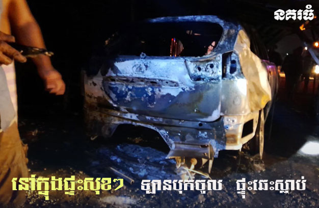 ខេត្តកំពង់ចាម ៖ ស្ត្រីម្នាក់ កំពុងនៅក្នុងផ្ទះសុខៗ ស្រាប់តែមានបុរសម្នាក់ បានបើករថយន្ត ១គ្រឿង ក្នុងល្បឿនលឿន បុកម៉ូតូ ១គ្រឿង ពេញទំហឹង បណ្តាលឱ្យបុរសជាអ្នកជិះម៉ូតូ រងរបួសធ្ងន់ ចំណែករថយន្ត បានជ្រុលបុកចូលផ្ទះរបស់ស្ត្រីរងគ្រោះ បណ្តាលឱ្យផ្ទុះឆេះទាំងរថយន្ត និងផ្ទះ ព្រមទាំងបណ្តាលឲ្យស្ត្រីជាម្ចាស់ផ្ទះ ស្លាប់នៅនឹងកន្លែង ឯបុរសជាប្តី រងរបួសស្រាល។ ចំណែកអ្នកបើកបររថយន្តបង្កហេតុ រងរបួសធ្ងន់។