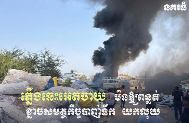 ភ្នំពេញ ៖ គំនរអេតចាយមួយកន្លែងដែលមានសុទ្ធតែជាគ្រឿងជ័រ ត្រូវបានភ្លើងឆាបឆេះសន្ធោសន្ធៅ និងផ្សែងហុយឃ្មួលខ្មាញ់ បង្កឱ្យមានការភ្ញាក់ផ្អើលទាំងថ្ងៃ ដែលសង្ស័យបណ្តាលមកពីក្មេងៗ ដុតភ្លើងលេង ភ្លាមៗនោះម្ចាស់ទីតាំងអេតចាយ បានយកគ្រឿងចក្រកាយអេតចាយ ផ្តាច់គំនរចេញពីគ្នា និងកាយដីលុបភ្លើង ព្រមទាំងយកទុយោបាញ់ទឹកពន្លត់ភ្លើង ហើយភ្លាមនោះ រថយន្តពន្លត់អគ្គិភ័យ ក៏បានចុះទៅដល់ ដើម្បីអន្តរាគមន៍ដែរ តែត្រូវបានម្ចាស់ទីតាំងរារាំងមិនឱ្យរថយន្តពន្លត់អគ្គិភ័យ បាញ់ទឹកពន្លត់ទេ ដោយខ្លាចរថយន្តពន្លត់អគ្គិភ័យ យកលុយកាក់ រហូតដល់មានអន្តរាគមន៍ពីលោកចៅសង្កាត់ត្រពាំងក្រសាំង ទើបម្ចាស់ទីតាំងយល់ព្រមឱ្យឡានទឹក បាញ់ពន្លត់ អស់ទឹក១ឡាន ទើបភ្លើងរលត់ទាំងស្រុង។