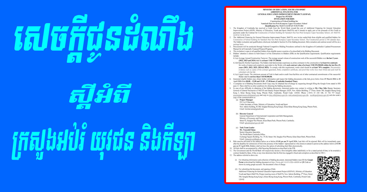 Homeព័ត៌មានជាតិសេចក្តីជូនដំណឹង ស្តីអំពី ក្រសួងអប់រំ យុវជន និងកីឡា ព័ត៌មានជាតិ សេចក្តីជូនដំណឹង ស្តីអំពី ក្រសួងអប់រំ យុវជន និងកីឡា By Davin March 24, 2026 0 0 Share FacebookTwitterPinterestWhatsApp RELATED ARTICLES ព័ត៌មានជាតិ កំណាយស្រាវជ្រាវឡដុតកុលាលភាជន៍ នៅគោកព្នៅ April 4, 2026 ព័ត៌មានជាតិ វេទិកាសារព័ត៌មាន “រួមគ្នាផលិត រួមគ្នាប្រើផលិតផលជាតិ» April 4, 2026 ព័ត៌មានជាតិ អាកាសធាតុក្តៅខ្លាំង ក្រសួងសុខាភិបាល ណែនាំរក្សាសុខភាព April 4, 2026