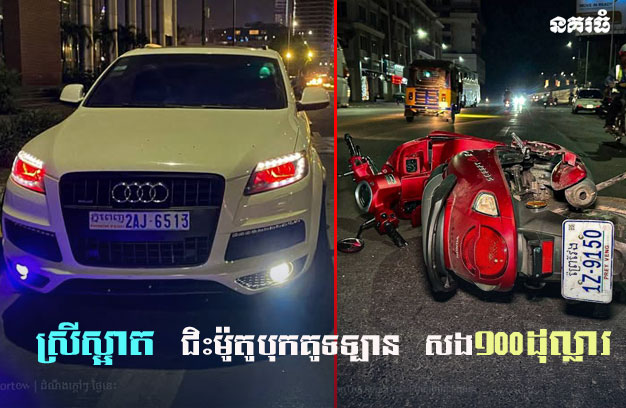 តាមប្រភពព័ត៌មានពីកន្លែងកើតហេតុ បានឱ្យដឹងថា មុនពេលកើតហេតុ គេឃើញរថយន្ត ១គ្រឿង ម៉ាក AUDI Q7 ពណ៌ស ពាក់ស្លាកលេខ ភ្នំពេញ 2AJ-6513 ចតស្ងៀមនៅលើចិញ្ចើមផ្លូវត្រង់ចំណុចកើតហេតុខាងលើ។ លុះបន្តិចក្រោយមក មាននារីរូបស្រស់ ចំនួន២នាក់ ជិះម៉ូតូ ១គ្រឿង ម៉ាកហុងដា ស្កុបពី ពណ៌ក្រហម ពាក់ ស្លាកលេខ ព្រៃវែង 1Z-9150 មកពីក្រោយ រួចជ្រុលបុករថយន្ត បណ្តាលឱ្យខួចខាត ចំណែកស្រីស្អាតទាំង២នាក់ បានរងរបួសរលាត់ក្បាលជង្គង់។