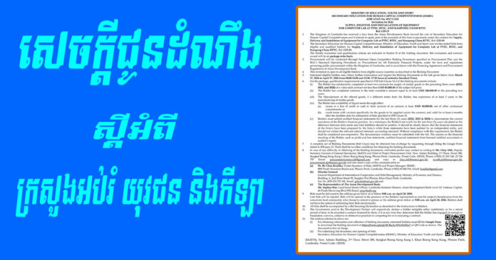Homeព័ត៌មានជាតិសេចក្តីជូនដំណឹង ស្តីអំពី ក្រសួងអប់រំ យុវជន និងកីឡា ព័ត៌មានជាតិព្រឹត្តិការណ៍សង្គម សេចក្តីជូនដំណឹង ស្តីអំពី ក្រសួងអប់រំ យុវជន និងកីឡា By Davin March 27, 2026 0 0 Share FacebookTwitterPinterestWhatsApp RELATED ARTICLES ព័ត៌មានជាតិ កំណាយស្រាវជ្រាវឡដុតកុលាលភាជន៍ នៅគោកព្នៅ April 4, 2026 ព័ត៌មានជាតិ វេទិកាសារព័ត៌មាន “រួមគ្នាផលិត រួមគ្នាប្រើផលិតផលជាតិ» April 4, 2026 ព័ត៌មានជាតិ អាកាសធាតុក្តៅខ្លាំង ក្រសួងសុខាភិបាល ណែនាំរក្សាសុខភាព April 4, 2026