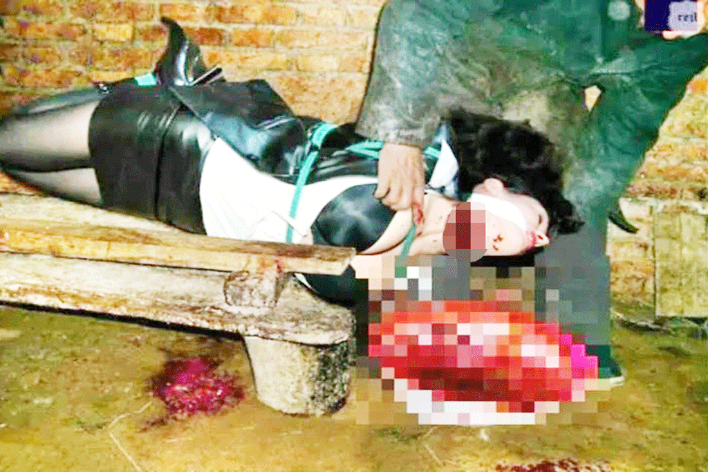 យោងតាមរូបភាពទី១ គេឃើញនារីវ័យ ក្មេងរូបស្រស់ ស្ថិតក្នុងសម្លៀកបំពាក់ពណ៌ខ្មៅ ទំនងជានារីបម្រើការតាមក្លឹបរាត្រី ត្រូវបាន គេចាប់ចងដៃជើងជាប់ រួចចាប់អារកសម្រក់ ឈាមដាក់ក្នុងចានដែកមួយ។ ចំណែករូបភាព ទី២ គេឃើញបុរស៣នាក់ បានធ្វើសកម្មភាព វះពោះទាញយកគ្រឿងក្នុងរបស់នារីរងគ្រោះ ដែលមើលទៅគួរឱ្យតក់ស្លុតរន្ធត់ចិត្តបំផុត។