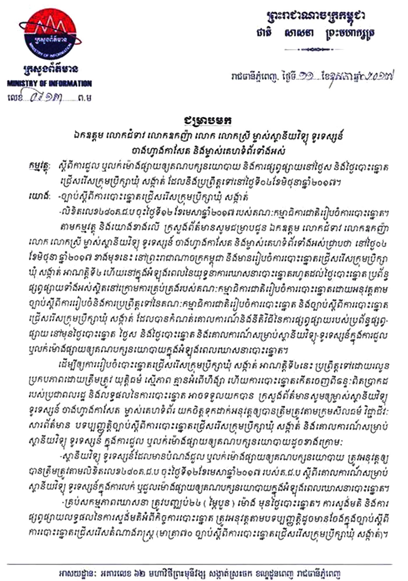 ភ្នំពេញៈ ក្រសួងព័ត៌មាន បានចេញសេចក្ដីជូនដំណឹង ដល់ម្ចាស់ស្ថានីយ វិទ្យុ, ទូរទស្សន៍ ចាងហ្វាងកាសែត និង ម្ចាស់គេហទំព័រ ស្តីពីការជួល ឬលក់ម៉ោងផ្សាយ ឲ្យគណបក្សនយោបាយ និងការផ្សព្វផ្សាយ នៅថ្ងៃស និងថ្ងៃ បោះឆ្នោតជ្រើសរើសក្រុមប្រឹក្សាឃុំ សង្កាត់ ដែលនឹងប្រព្រឹត្តទៅនៅថ្ងៃទី០៤ ខែមិថុនា ឆ្នាំ២០១៧ ខាងមុខនេះ ។សេចក្ដីជូនដំណឹងរបស់ក្រសួងព័ត៌មាន ចុះថ្ងៃទី១១ ខែឧសភា ឆ្នាំ២០១៧ ដែលចុះហត្ថលេខាដោយលោករដ្ឋ មន្រ្តី ខៀវ កាញារីទ្ធិ បានបញ្ជាក់ជាច្រើនចំណុច ក្នុងនោះរួមមាន ហាមការផ្សព្វផ្សាយព័ត៌មានដោយទុច្ចរិត ដែល ធ្វើឲ្យបាត់បង់ទំនុកចិត្តលើការសម្ងាត់នៃការបោះឆ្នោត និងធ្វើឲ្យមានការភាន់ច្រឡំនាំឲ្យបាត់ទំនុកចិត្តលើការ បោះឆ្នោត ៕