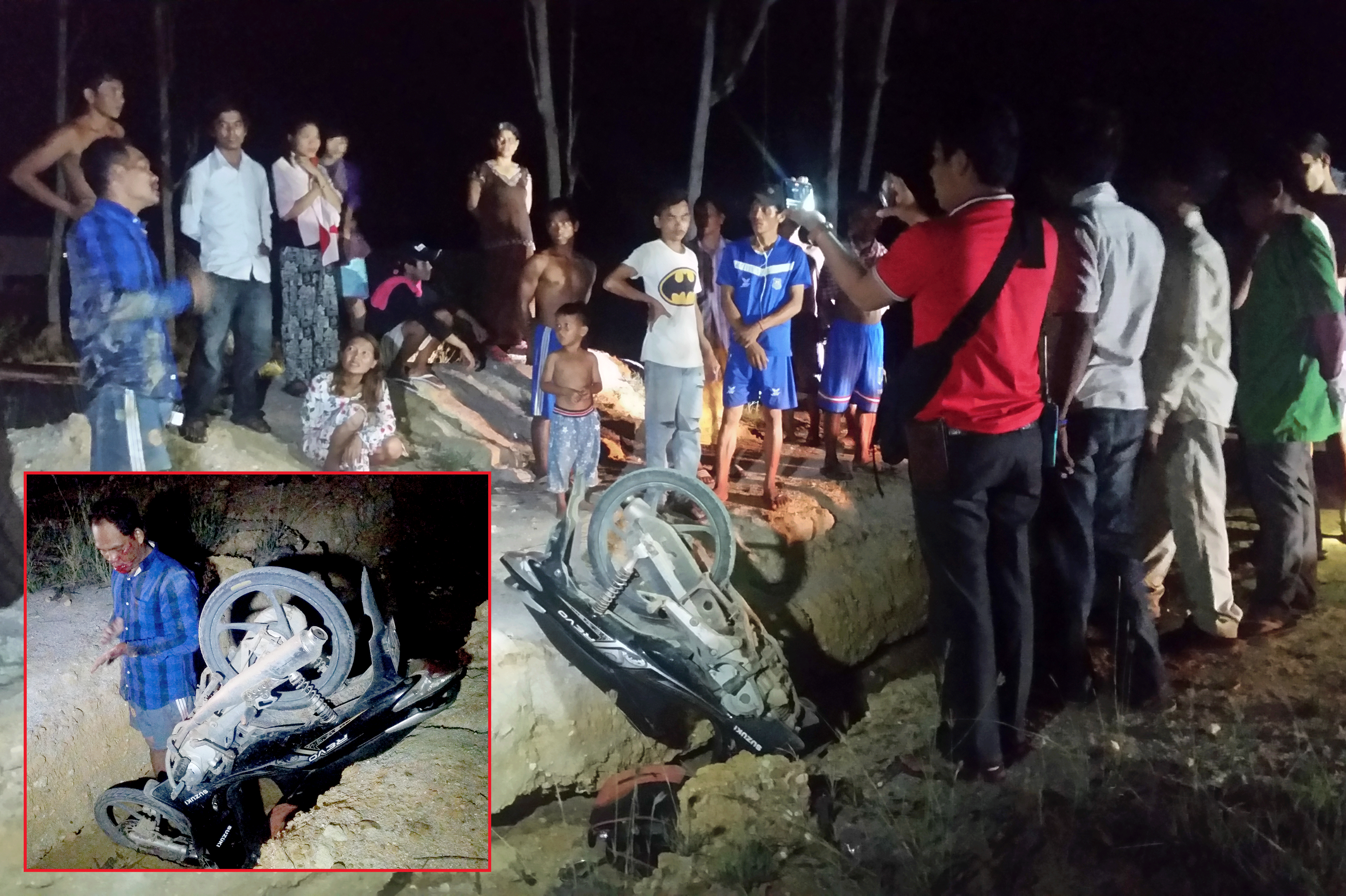 ភ្នំពេញ ៖ បុរសម្នាក់ឈ្លោះជាមួយប្រពន្ធវេចខោអាវទៅលេងផ្ទះមិត្តភក្តិ ជិះម៉ូតូតាមផ្លូវងងឹតហើយស្រវឹងស្រាផងនោះ បានរេចង្កូតធ្លាក់ប្រឡាយ អត់មានទឹក បណ្តាលឲ្យរងរបួសបែកមុខមាត់ បង្កឲ្យមានការភ្ញាក់ផ្អើល កាលពីវេលាម៉ោង១០និង៤៥នាទីយប់ ថ្ងៃទី២៩ ខែឧសភា ឆ្នាំ២០១៧ តាមបណ្តោយផ្លូវដី ស្ថិតនៅភូមិដូង សង្កាត់ចោមចៅ ខណ្ឌពោធិ៍សែនជ័យ ។