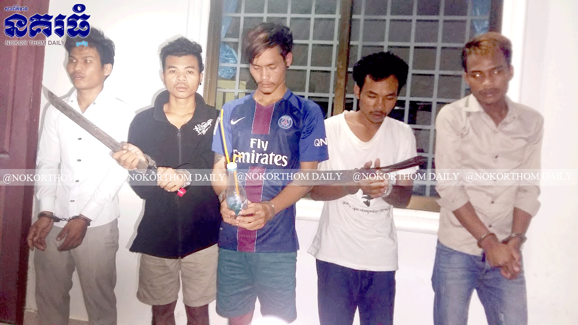 ខេត្តព្រះសីហនុ៖ ក្រុមយុវជនជាបុគ្គលិកកាស៊ីណូខ្សាច់មាស ចំនួន០៥នាក់ នាយប់ថ្ងៃទី១២ ខែមិថុនា ឆ្នាំ២០១៧ វេលាម៉ោង២១និង១០នាទី ត្រូវបានសមត្ថកិច្ចចាប់ខ្លួនបញ្ជូនទៅកាន់ស្នងការដ្ឋាននគរបាលខេត្ត ដើម្បីសាកសួរបន្ទាប់ពីពួកគេបានធ្វើសកម្មភាពអុកឡុកនៅតាមផ្លូវ ត្រង់ចំណុចក្រុមទី១៧ ភូមិ០៤ សង្កាត់លេខ០៤ ខេត្តព្រះសីហនុ ដោយក្រុមយុវជនទាំងនេះបានកាន់ដាវសាម៉ូរ៉ៃបម្រុងដេញកាប់អ្នកធ្វើដំណើរតាមផ្លូវ។