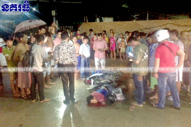 ភ្នំពេញ ៖ បុរសម្នាក់ជិះម៉ូតូទាក់ដៃចង្កូតជាមួយម៉ូតូមួយគ្រឿងទៀត បណ្តាលឲ្យខ្ទាតចូលក្រោមរថយន្តកុងតឺន័រកិនបែកក្បាលស្លាប់ គួរឲ្យរន្ធត់ ហេតុការណ៍នេះកើតឡើងនៅវេលាម៉ោង៨យប់ ថ្ងៃទី២១ ខែមិថុនា ឆ្នាំ២០១៧ ទល់មុខកន្លែង កុងស៊ីកាប់ជ្រូក ផ្លូវវេងស្រេង ភូមិដំណាក់៤ សង្កាត់ស្ទឹងមានជ័យ ខណ្ឌមានជ័យ ។