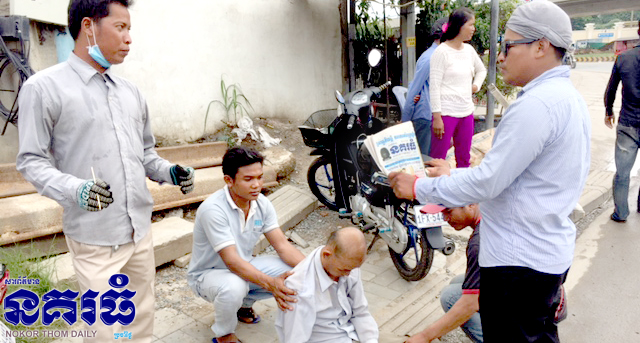ភ្នំពេញ : បុរសវ័យចំនាស់ម្នាក់ ពេលជិះរថយន្តម៉ាកសាំយ៉ុង ពណ៍សំបកឪឡឹក ពាក់ស្លាកលេខ ភ្នំពេញ ២H-៣០៥០ ចេញពីខេត្តតាកែវ ហើយមកដល់ឈប់នៅក្បែរស្ពានអាកាសក្បាលថ្នល់ ចុះពីលើរថយន្តបម្រុងជិះម៉ូតូឌុប ក៏ខ្យល់គរប្រកាច់ ត្រូវអ្នករត់ម៉ូតូទ្រជាប់មិនឲ្យដួល បង្កឲ្យការភ្ញាក់ផ្អើលកាលវេលាម៉ោង១០និង១៥នាទីព្រឹក ថ្ងៃទី២១ ខែកកក្កដា ឆ្នាំ២០១៧ នៅចំណុចស្ពានអាកាសក្បាលថ្នល់ តាមផ្លូវព្រះមុន្នីវង្ស សង្កាត់ទន្លេបាសាក់ ខណ្ឌចំការមន។