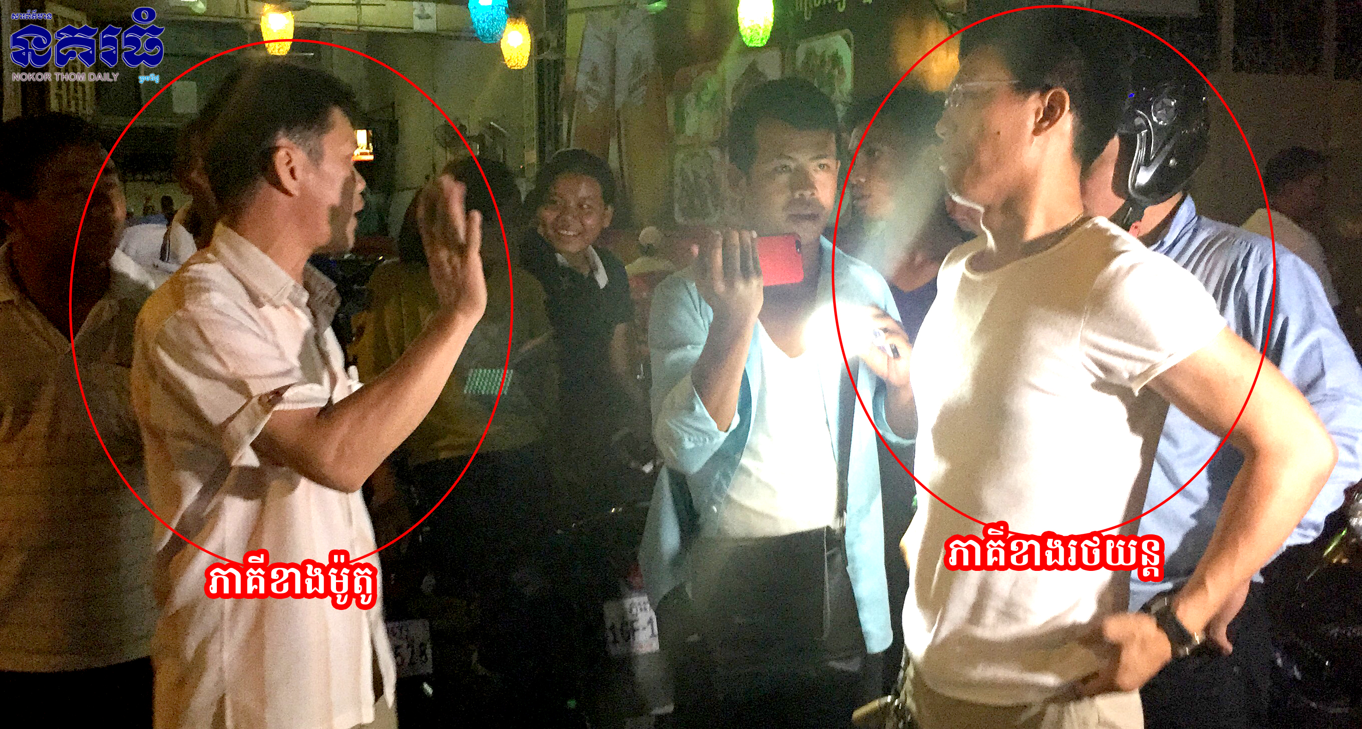 អោយភាគីទាំងសងខាងសុំមិននិយាយរឿងអាវុធ ពីព្រោះសុទ្ធតែជាអ្នកធ្វើការដូចគ្នា ហើយឲ្យមកនិយាយរឿងចរាចរណ៍វិញម្តង ដោយខាងម៉ូតូទារសំណងថ្លៃព្យាបាលរបួស និងជួសជុលម៉ូតូ ចំនួន៥០ដុល្លារ តែខាងរថយន្តអត់ព្រម គឺសុំស្មើគ្នា ដោយសារតែការសម្របសម្រួលគ្នាអត់ត្រូវអាងអំនួតរៀងខ្លួន រថយន្តនិងម៉ូតូត្រូវបានសមត្ថកិច្ច ធ្វើការវាស់វែងយកទៅរក្សាទុកនៅការរិយាល័យចរាចរណ៍ជើងគោក ដើម្បីធ្វើការដោះស្រាយនៅពេលក្រោយ៕