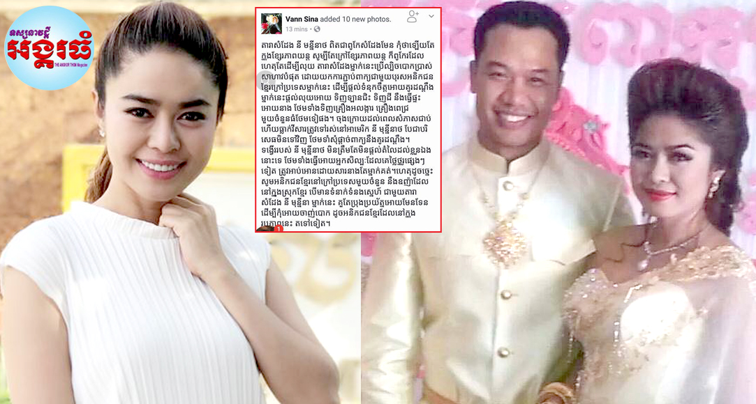 ក្រោយពេលលោកសូឡាំង បង្ហោះសារខាងលើនេះ ទំព័រហ្វេសបុកឈ្មោះ Vann sina ក៏បានបង្ហោះសំណេរចោទប្រកាន់ធ្ងន់ៗផងដែរថា ”តារាសម្ដែងនី មុន្នីនាថ ពិតជាពូកែសំដែងមែន កុំថាឡើយតែក្នុងខ្សែរភាពយន្ត សូម្បីតែក្រៅខ្សែភាពយន្ត ក៏ពូកែដែរ ហេតុតែដើម្បីលុយ តារាសម្ដែងម្នាក់នេះប្រើល្បិចបោកប្រាស់សាហាវបំផុត ដោយយកការភ្ជាប់ពាក្យជាមួយបុរសអាណិកជនខ្មែរក្រៅប្រទេសម្នាក់នេះ ដើម្បីផ្តល់ទំនុកចិត្តអោយគូដណ្តឹងម្នាក់នេះផ្តល់លុយឲ្យទិញឡានជិះ ទិញដី នឹងធ្វើផ្ទះឲ្យនាង ថែមទាំងទិញគ្រឿងអលង្ការ គ្រឿងពេជ្រមួយចំនួនធំថែមទៀផង។ ចុងក្រោយដល់ពេលសម្ភាសន៍ជាប់ ហើយធ្លាក់វីសា ត្រូវទៅរស់នៅអាមេរិក នី មុន្នីនាថ បែរជាបដិសេធមិនទៅវិញ ថែមទាំងសុំផ្តាច់ពាក្យនឹងគូដណ្តឹង។ទង្វើរបស់នី មុន្នីនាថ មិនត្រឹមតែមិនផ្តល់តម្លៃដល់ខ្លួនឯងនោះទេ ថែមទាំងធ្វើអោយអ្នកសិល្បៈដែលគេថ្លៃថ្នូរផ្សេងៗទៀត ត្រូវអាប់ឱនដោយសារនាងតែម្នាក់គត់។ ហេតុដូច្នេះ សូមអណិកជនខ្មែរនៅក្រៅប្រទេសមួយចំនួន នឹងឧញ៉ាដែលនៅក្នុងស្រុកខ្មែរ បើមានទំនាក់ទំនងស្នេហ៍ជាមួយតារាសម្ដែងនី មុន្នីនាថ ម្នាក់នេះ គួតែប្រុងប្រយ័ត្នឲ្យមែនទែន ដើម្បីកុំឲ្យចាញ់បោកដូចអាណិកជនខ្មែរ ដែលនៅក្នុងរូបភាពនេះតទៅទៀត”។