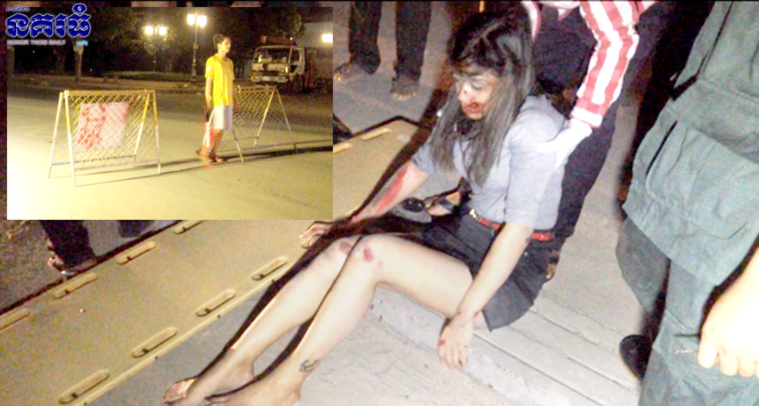 ភ្នំពេញ ៖ នារីវ័យក្មេងរូបស្រស់ម្នាក់ ស្រវឹងស្រាជិះម៉ូតូបោះពួយយ៉ាងលឿន ចាប់ហ្រ្វាំងមិនទាន់ ក៏ជ្រុលទៅបុករនាំងដែក ដែលគេដាក់បាំងការដ្ឋានជួសជុលផ្លូវ សម្រាប់ឲ្យរថយន្តនិងម៉ូតូជិះវាងបណ្តាលឲ្យដួលរងរបួសបែកមុខបែកមាត់ ហេតុការណ៍នេះកើតឡើងកាលពីវេលាម៉ោង១២និង៥០នាទីរំលងអធ្រាត្ រឈានចូលថ្ងៃទី០៧ ខែកញ្ញា ឆ្នាំ២០១៧ ត្រង់ចំណុចខាងមុខបណ្ណាល័យ ហ៊ុន សែន តាមបណ្តោយផ្លូវ៥៩៨ ស្ថិតក្នុងសង្កាត់ទឹកថ្លា ខណ្ឌសែនសុខ ។