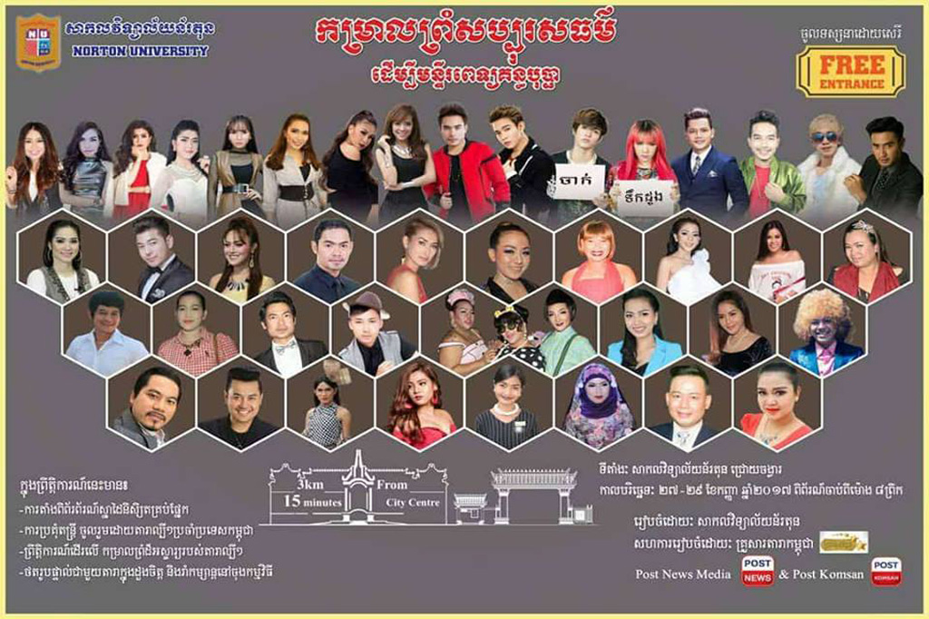 ជាថ្មីម្ដងទៀតសាកលវិទ្យាល័យន័រតុន បានរួមសហការជាមួយ “គ្រួសារតារាកម្ពុជា” រៀបចំព្រឹត្តិការណ៍ “កម្រាលព្រំសប្បុរសធម៌ធំមួយ ដើម្បីមន្ទីរពេទ្យគន្ធបុប្ផា” ក្នុងគោលបំណងរៃអង្គាសថវិកា ជូនដល់មន្ទីរពេទ្យគន្ធបុប្ផាដែលនឹងប្រព្រឹត្តទៅចាប់ពីថ្ងៃទី២៧ ដល់ថ្ងៃទី២៩ កញ្ញា ឆ្នាំ២០១៧ ខាងមុខនេះ ខណៈដែលក្នុងឱកាសនោះមហាជនគ្រប់ទិសទីនឹងអាចចូលរួមកំសាន្តសប្បាយដោយសេរី ជាមួយទស្សនីយភាពរួមមានការច្រៀងរាំ ដើរម៉ូដ និងកំប្លែងពីក្រុមសិល្បករ-សិល្បការនីល្បីៗនៅក្នុងប្រទេសកម្ពុជាដែលសុទ្ធសឹងតែបានស្ម័គ្ររួមគ្នាជួយក្នុងព្រឹត្តិការណ៍នោះ ដើម្បីជាប្រយោជន៍ដល់មន្ទីរពេទ្យគន្ធបុប្ផា។