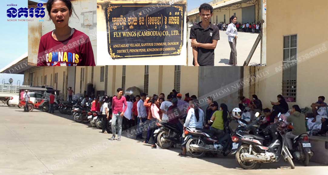 ភ្នំពេញ ៖ រោងចក្រផលិតស្បែកជើងយីហោ ហ្ល្វាយ វីង ខូអិលធីឌី ដែលមានទីតាំងស្ថិតនៅតាមផ្លូវបេតុង ភូមិអង្គត្រគៀត សង្កាត់កន្ទោក ខណ្ឌពោធិសែនជ័យ ថៅកែក្រុមហ៊ុន ជម្រុញឲ្យកម្នករធ្វើការងារផលិតស្បែកជើង រយៈពេល២ខែ បែរជាគ្មានប្រាក់មួយរៀលបើកជូនកម្មករ ទ្រាំលែងបាន ម្យ៉ាងហូបចុក ម្យ៉ាងថ្លៃផ្ទះជួល កម្មករនាំគ្នាឈប់ធ្វើការប្រមូលផ្តុំធ្វើកូដកម្មតវ៉ា ទាមទាររកប្រាក់ឈ្នួលរបស់ខ្លួន កាលពីវេលាម៉ោង១១ព្រឹក ថ្ងៃទី២៦ ខែតុលា ឆ្នាំ២០១៧ នេះ។