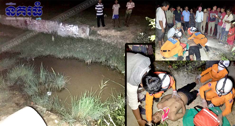 បើករថយន្តបុកម៉ូតូ ខ្ទាតមនុស្សធ្លាក់ចូលទឹកលូ រងរបួសធ្ងន់ម្នាក់