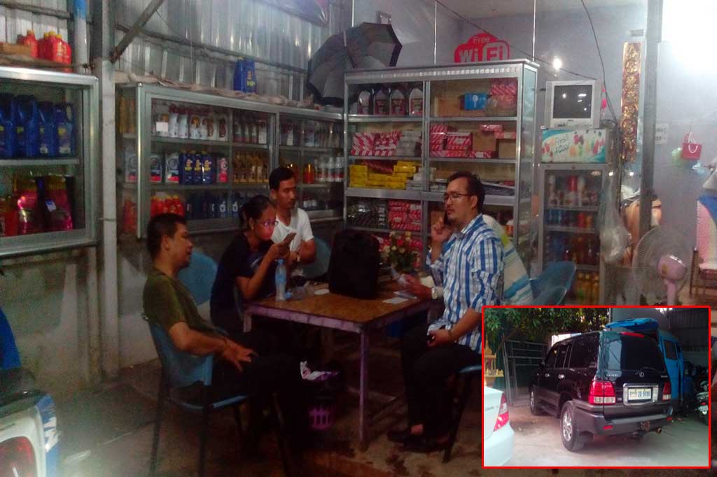 តាមការបំភ្លឺបុរសឈ្មោះគឹម ទ្រី អាយុ៦៤ឆ្នាំ ម្ចាស់យានដ្ឋាន បានប្រាប់សមត្ថកិច្ចថាកាលពីព្រឹកថ្ងៃទី២៥ ខែកក្កដា មានបុរស២នាក់បានយករថយន្តមួយគ្រឿងម៉ាកឡិចស៊ីស៤៧០ពណ៌ខ្មៅពាក់ស្លាកលេខ ភ្នំពេញ2D-9090 មកលាងនៅយានដ្ឋានរបស់គាត់ក្រោយពីលាងហើយបានសួរគាត់ថានៅទីនេះទទួលផ្ញើរថយន្តអត់គាត់បានប្រាប់ថាទទួលផ្ញើក្នុង១ថ្ងៃ៤០០០រៀលហើយបុរសខាងលើបានប្រាប់ថាផ្ញើររួចក៍ឡើងជិះរថយន្តមិនចាំម៉ាកទាំង២នាក់ទៅបាត់ទៅរហូតដល់ល្ងាចថ្ងៃទី២៨ ខែកក្កដា ឃើញមានសមត្ថកិច្ចមកសាកសួរគាត់តែម្តង។