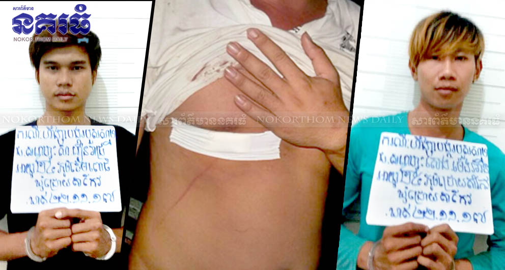 ខេត្តកណ្តាល ៖ ជនសង្ស័យ២នាក់ ក្រោយពីផឹកស៊ីស្រវឹងធ្លាក់ភ្នែក នាំគ្នាជិះម៉ូតូដើរលេង លុះគ្រាន់តែឃើញគេសម្លឹងមើលមុខ ក៏បានព្រួតគ្នាវាយតប់ និងចាក់ប្រហារ បណ្តាលឱ្យបុរស ម្នាក់រងរបួសធ្លាយដោះ និងត្រូវបានសមត្ថកិច្ច ចុះអន្តរាគមន៍ចាប់ឃាត់ខ្លួនជនសង្ស័យទាំង២ នាក់ យកទៅសាកសួរ កាលពីវេលាម៉ោង៥ល្ងាច ថ្ងៃទី២២ ខែវិច្ឆិកា ឆ្នាំ២០១៧ នៅចំណុចខាង មុខការដ្ឋានក្រឡុកស៊ីម៉ងត៍ ខាងក្រោមស្ពាន មិត្តភាពកម្ពុជា-ចិន កោះធំ ស្ថិតក្នុងភូមិព្រែកថ្មី ឃុំជ្រោយតាកែវ ស្រុកកោះធំ។