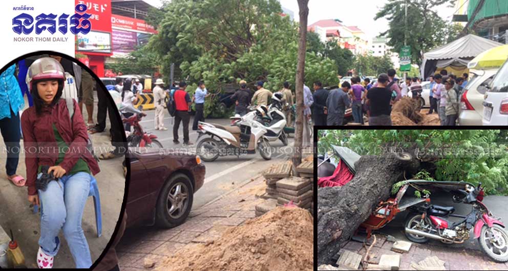 តាមសម្តីបុរសឈ្មោះសុខ ធុច អាយុ៣៨ឆ្នាំ មុខរបររត់រ៉ឺកម៉កម៉ូតូកង់បី ស្នាក់នៅភូមិគោកខ្សាច់ សង្កាត់ភ្លើងឆេះរទេះ ខណ្ឌពោធិ៍សែនជ័យ បានរៀបរាប់ប្រាប់ថា នៅមុនកើតហេតុ គាត់បានដឹកភ្ញៀវពីចោមចៅមកបុណ្យសពនៅក្បែរកន្លែងកើតហេតុ លុះមកដល់រោងបុណ្យ ស្ត្រីជា ភ្ញៀវបានប្រាប់គាត់ឱ្យរង់ចាំបន្តិច ចាំដឹកគាត់ត្រឡបទៅ់ផ្ទះវិញ បន្ទាប់មកគាត់ក៏បានជិះម៉ូតូកង់បីទៅចត ក្រោមដើមឈើធំមួយដើមនេះ។ បុរសខាងលើបន្តថា លុះពេលអង្គុយបានមួយសន្ទុះ ស្រាប់តែដើមឈើនេះ បានបាក់សង្កត់មកលើរ៉ឺម៉កម៉ូតូកង់បីរបស់គាត់ ធ្វើឱ្យគាត់ មានការភិតភ័យ ស្ទុះលោតចេញពីម៉ូតូខ្លាចមានគ្រោះថ្នាក់ ហើយដើមឈើនោះ ក៏បានសង្កត់ទៅលើរថយន្តកូរ៉េ១គ្រឿង បណ្តាលឱ្យបែកកញ្ចក់ខាងមុខ ព្រមទាំងសង្កត់នារីម្នាក់ជិះម៉ូតូកូនទា តែសំណាងល្អមិនមានរបួសទេ គ្រាន់តែធ្វើឱ្យមានការភិតភ័យប៉ុណ្ណោះ។ យ៉ាងណាគាត់ទាមទារ ឱ្យខាងមន្ទីរសាធារណការ សងថ្លៃខូចខាតពួកគាត់ទាំង៣នាក់ ក្នុងនោះរ៉ឺម៉កម៉ូតូកង់បីគាត់ខូចខាតស្ទើរទាំងស្រុងច្រើនជាងគេ។