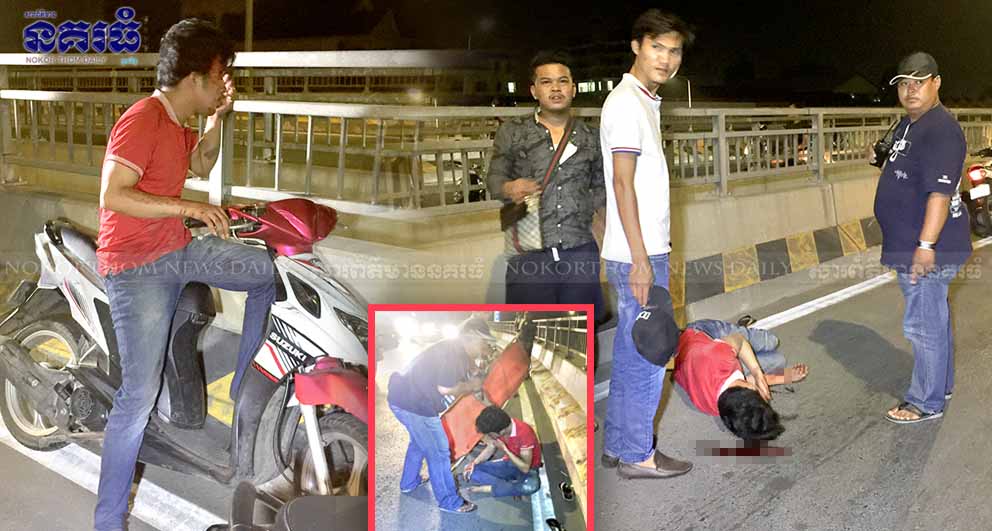 ភ្នំពេញ ៖ យុវជនម្នាក់ចេញពីផឹកស៊ីវិញ ស្រវឹងទោរទន់បានជិះម៉ូតូជ្រុលទៅទាក់ដៃចង្កូតជាមួយនិងបង្កាន់ដៃស្ពានអាកាសស្ទឹងមានជ័យ បណ្តាលអោយអ្នកបើកម៉ូតូដួលបោកក្បាលរងរបួសធ្ងន់ ហេតុការណ៍នេះបានកើតឡើងនៅវេលាម៉ោង១២និង៣០នាទីរំលងអាធ្រាត្រ ឈានចូលថ្ងៃទី១៤ ខែធ្នូ ឆ្នាំ២០១៧ នៅចំណុចលើស្ពានអាកាសស្ទឹងមានជ័យ ផ្លូវ២៧១ សង្កាត់ស្ទឹងមានជ័យ១ ខណ្ឌមានជ័យ ។