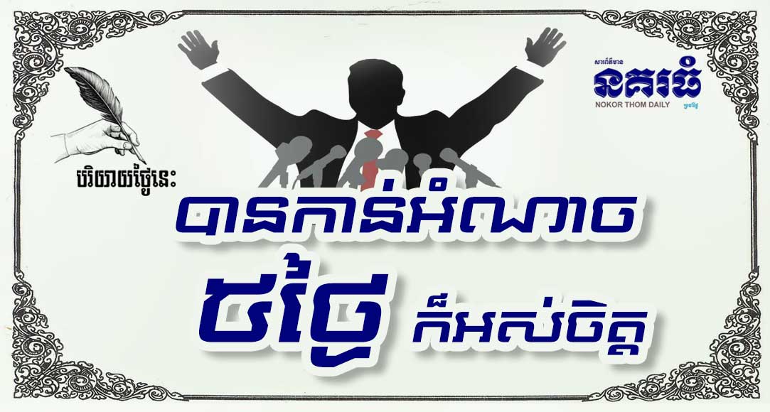 ឥស្សរជនថ្នាក់កំពូលដែលកាន់ចង្កូតប្រទេសនីមួយៗ មានព្រះមហាក្សត្រ ប្រធានាធិបតី នាយករដ្ឋមន្ត្រី និងរាជានុសិទ្ធិ តាមរបបផ្សេងគ្នា ខ្លះកាន់អំណាចបានរាប់សិបឆ្នាំ ខ្លះទៀតបាន៥ឆ្នាំ ខ្លះ១០ខែ ខ្លះ៥ថ្ងៃ។ ទោះជានៅក្នុងតំណែងកំពូល មិនបានយូរក៏ “អស់ចិត្តដែរ” រហូតមានអតីតមន្ត្រីបក្សសង្គ្រោះជាតិ ខ្លះបង្ហើបថា “ឱ្យតែបានកាន់អំណាច៥ថ្ងៃ ក៏អស់ចិត្ត ដែរ” ទើបពួកគេនៅតែបន្តការប្រឆាំងរដ្ឋាភិបាល បង្កើតជា “ចលនាលសង្គ្រោះជាតិ” ដើម្បីអំណាច ដែល “នគរធំ” សូម លើករឿង “កាន់អំណាច” មកធ្វើប្រធានបទបរិយាយថ្ងៃនេះ…។