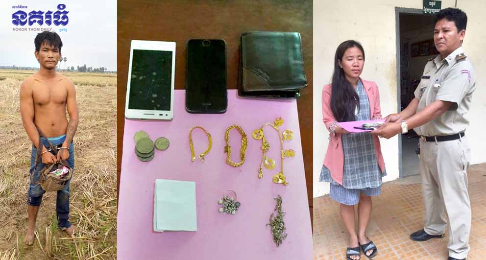 តាមបភពពីសមត្ថកិច្ចបានឱ្យដឹងថា នៅមុនពេលឃាត់ខ្លួននោះ គឺកម្លាំងបានទទួលពាក្យ បណ្តឹងពីស្ត្រីរងគ្រោះ មានចោរចូលលួចទ្រព្យសម្បត្តិអស់ខ្សែដៃមាស១ខ្សែ ទម្ងន់៣ជី ខ្សែដៃប្លាក១ខ្សែ ទម្ងន់១,៣០ (មួយជីបីហ៊ុន) ខ្សែជើងប្លាកទីន ទម្ងន់១ជីកន្លះ ចិញ្ជៀនប្លាកទីន១វង់ ទម្ងន់១ជី ខ្សែកថា ប្រាក់១ខ្សែ ទូរស័ព្ទដៃចំនួន៣គ្រឿង អាយហ្វូនហ្វាយ១គ្រឿង និងម៉ាក ហូវៃ១គ្រឿង លុយខ្មែរចំនួន១០ម៉ឺនរៀល លុយ ដុល្លារ១២០ដុល្លារ និងឯកសារមួយចំនួនទៀត ត្រូវបានជនសង្ស័យធ្វើសកម្មភាពលួចកាល ពីវេលាម៉ោង២ និង៤០នាទីទៀបភ្លឺ ថ្ងៃទី០១ ខែកុម្ភៈ ឆ្នាំ២០១៨ ភ្លាមនោះ កម្លាំងសមត្ថកិច្ចជំនាញបានចុះទៅដល់ចំណុចផ្ទះស្ត្រីរងគ្រោះខាងលើ ដោយឆែកមើលតាមកាមេរ៉ាសុវត្ថិភាព ឃើញជនសង្ស័យនៅក្នុងកាមេរ៉ា និងស្គាល់អត្តសញ្ញាណច្បាស់ ក៏បើកប្រតិបត្តិការចុះចាប់ខ្លួនជនសង្ស័យតែម្តង ដោយដកហូតវត្ថុតាងមួយចំនួនជារបស់នារីរងគ្រោះមកវិញផងដែរ។
