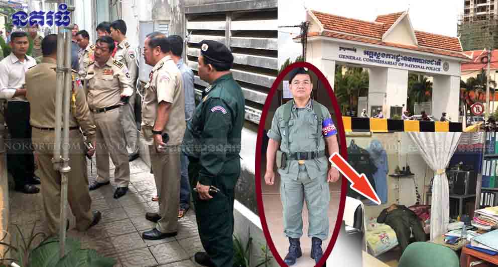 ភ្នំពេញ ៖ បុរសជាមន្ត្រីនគរបាលម្នាក់ ព្រោះតែតូចចិត្តនឹងកើតមានជំងឺរ៉ាំរ៉ៃប្រចាំកាយ ព្យាបាលរាប់ឆ្នាំមិនជាសះស្បើយ ក៏ដាច់ចិត្តគិតខ្លី ទាញកាំភ្លើងអាការបាញ់ប្រហារខ្លួនឯងចំនួន២គ្រាប់ បណ្តាលឱ្យស្លាប់ក្នុងថ្លុកឈាមយ៉ាងអាណោចអាធ័ម នៅក្នុងការិយាល័យធ្វើការរបស់ខ្លួនទាំង ព្រឹកព្រលឹម បង្កឱ្យមានការភ្ញាក់ផ្អើលឡើងយ៉ាងខ្លាំងពីថ្នាក់ដឹកនាំ និងមន្ត្រីនគរបាលនៅក្នុងអគ្គស្នងការដ្ឋាននគរបាលជាតិ កាលពីវេលាព្រឹក ថ្ងៃទី ០១ ខែមីនា ឆ្នាំ២០១៨ នៅចំណុចបន្ទប់ការិយាល័យការពារគោលដៅទី២ នៃនាយកដ្ឋាននគរបាលការពារ អគ្គស្នងការនគរបាលជាតិ ស្ថិតក្នុងសង្កាត់ទន្លេបាសាក់ ខណ្ឌចំការមន។