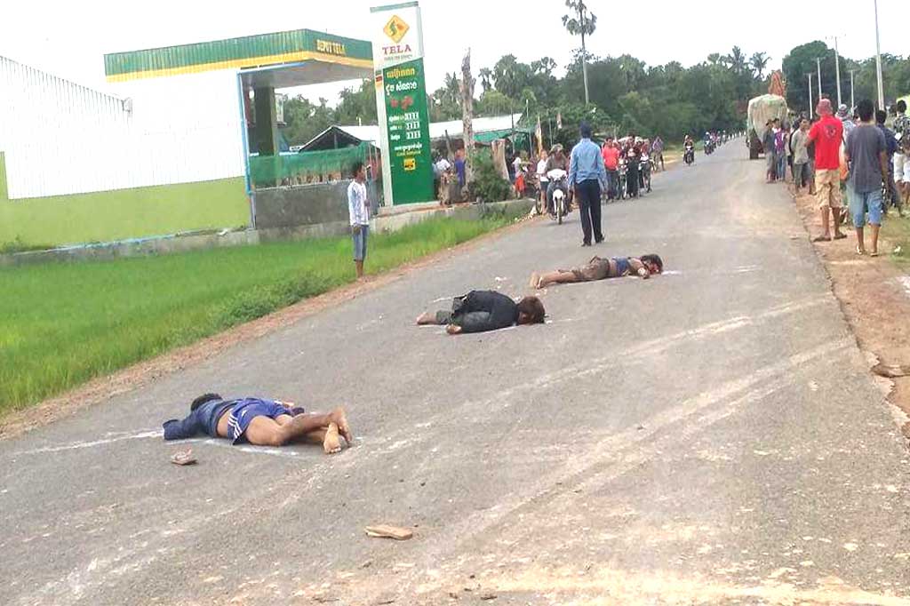ខេត្តកំពង់ឆ្នាំង៖ យុវជន4នាក់ បានជិះម៉ូតូ១គ្រឿងឌុបគ្នា ដួលកណ្តាលផ្លូវ ត្រូរថយន្តមកពីក្រោយកិនស្លាប់3នាក់នៅនឹងកន្លែង និងម្នាក់ទៀត រងរបួសធ្ងន់ ត្រូវគេដឹកបញ្ជូនទៅសង្រ្គោះនៅមន្ទីរពេទ្យ ដើម្បីសង្រ្គោះជីវិត ។ ហេតុការណ៍គ្រោះថ្នាក់ចរាចរណ៍ដ៏រន្ធត់មួយនេះ បានកើតឡើងកាលពីវេលាម៉ោង4និង50នាទីថ្ងៃទី10 ខែសីហា ឆ្នាំ2016 នៅលើកំណាត់ផ្លូវជាតិលេខ ១៥៣ ស្ថិតក្នុងភូមិដើមពពេល ឃុំថ្មឥដ្ឋ ស្រុកកំពង់ត្រឡាច ខេត្តកំពង់ឆ្នាំង ។