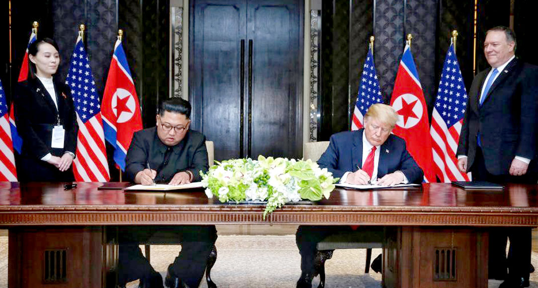 ក្រោយជំនួបពេញមួយព្រឹក ប្រធានាធិបតីអាមេរិក ដូណាល់ ត្រាំ និងមេដឹកនាំកូរ៉េខាងជើង គីម ជុងអ៊ុន បានចុះហត្ថលេខាលើសេចក្តីថ្លែងការណ៍រួមហើយ។