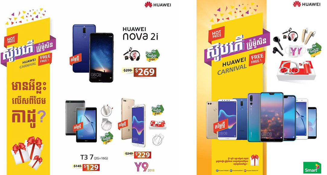 ភ្នំពេញ: ក្រុមហ៊ុន Smart Phone ឈានមុខលំដាប់ពិភពលោក Huawei ប្រចាំទេសកម្ពុជា ប្រកាសផ្តល់តម្លៃ និងកាដូពិសេសដល់អតិថិជនដែលជាវ Smart Phone និងTap Blat របស់ខ្លួនទាន់រដូវកាល Huawei CARNIVAL Super Promotion បានមកដល់ទៀតហើយ មហា Promotion មហាបញ្ចុះតម្លៃកប់ៗក្តោង មហារង្វាន់ដ៏ច្រើនសម្បើមមហស្ចារ្យ! តម្លៃពិសេសៗ កាដូពិសេសៗ ពី Huawei ថែមដូចព្យុះ ថែមអស់ស្ទះ ថែម ថែម ពី Huawei !!!។