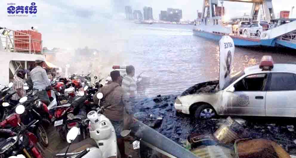 ភ្នំពេញ ៖ រថយន្តបំពាក់សឺរ៉ែនរបស់អធិការដ្ឋាននគរបាលស្រុកខ្សាច់កណ្តាល១គ្រឿង ពេលកំពុងស្ថិតនៅលើសាឡាង ដើម្បីឆ្លងទៅត្រើយម្ខាង ស្រាប់តែមានការឆាបឆេះយ៉ាងខ្លាំងចេញពីម៉ាស៊ីនរថយន្ត បង្កឱ្យមានការភ្ញាក់ផ្អើលដល់កម្មករលើសាឡាងយកបំពង់ពន្លត់អគ្គិភ័យ មកបាញ់មិនរលត់ លុះសាឡាងមកដល់ច្រាំង ក៏នាំគ្នារុញទម្លាក់ទឹក ទើបភ្លើងបានរលត់ទៅវិញទាំងស្រុង។
