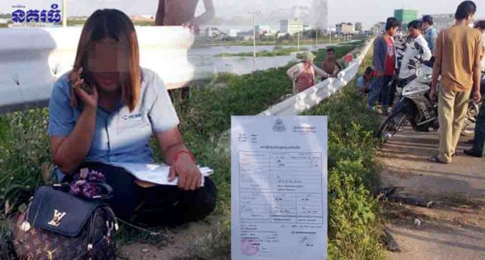 ស្ត្រីជាប្រពន្ធរូបនេះបន្តថា នៅពេលចេញពីភ្នំពេញមក ប្តីប្រពន្ធនាងមិនបានឈ្លោះប្រកែកគ្នាទេ តែពេលឆ្លងស្ពានអ្នកលឿងផុត នាងនឹក ឃើញប្តីប្រពន្ធស្រឡាញ់គ្នារៀបការរួមរស់ជាមួយគ្នាជិត៧ឆ្នាំ បែរជាមកត្រូវលែងលះគ្នាបែបនេះ គិតចុះគិតឡើងឈឺចិត្តពេក នាងក៏យកខ្នើយ ក្នុងឡានមកខ្ទប់មុខយំ ស្រាប់តែលឺសំឡេងបុកគ្រាំង លុះពេលនាងដកខ្នើយចេញ ក៏ឃើញឡានបុករបាំងដែកបាត់ទៅហើយ ទើបនាងស្រវា សោឡានកាច់ពន្លត់ ហើយក៏ត្រូវប្តីនាងដណ្តើមយកវិញ និងចាប់នាងអូសចេញពីឡាន រួចបើកឡានត្រឡប់ទៅភ្នំពេញវិញ បាត់ទុកនាងឱ្យនៅលើ អង្គុយយំលើថ្នល់តែម្នាក់ឯង ចំណែកប្តីបន្សល់ទុកស្លាកលេខរថយន្ត ដែលធ្លាក់ជ្រុះនៅកន្លែងកើតហេតុ និងធ្វើឱ្យកើតមានការផ្អើលឆោឡោ ចោម រោមមើលពីសំណាក់ប្រជាពលរដ្ឋ និងអ្នកដំណើរឆ្លងកាត់។