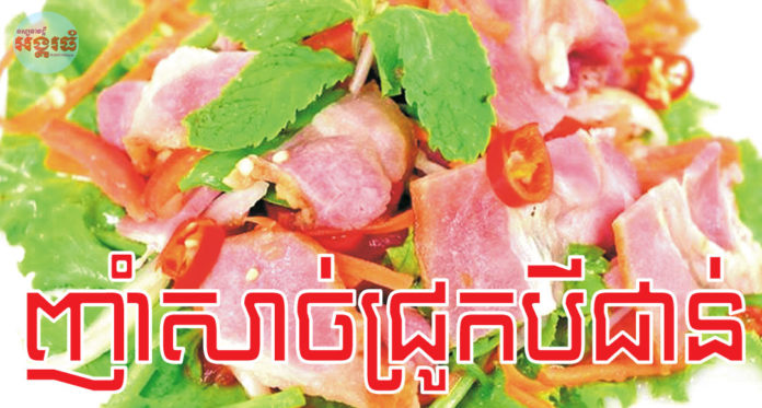-ធ្វើទឹកញាំដោយលាយម្ទេស ទឹកត្រី ស្ករស និងទឹកក្រូចឆ្មារ រួចកូរបញ្ចូលគ្នាឱ្យសព្វ ហើយទុកមួយអន្លើសិន។