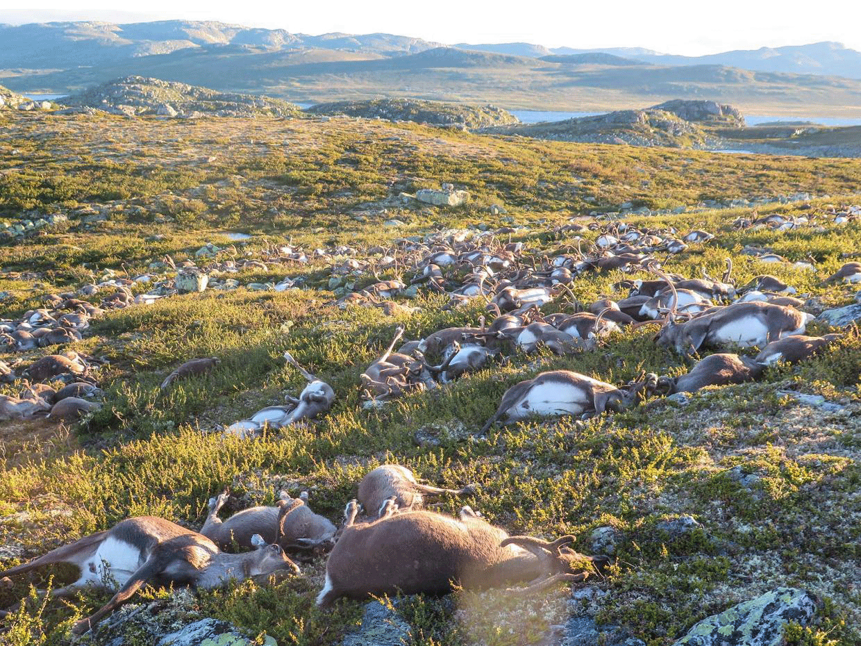 ទីភ្នាក់ងារ បរិស្ថានន័រ វែសបានចេញ ផ្សាយនូវ រូបភាពគួរឲ្យរន្ធត់ មួយដោយបង្ហាញ ពីភាពជ្រួលច្របល់ របស់សត្វព្រៃពពួក រមាំងដែល បានងាប់រដូករណែលពាសពេញតំបន់ តូចមួយនៅ តំបន់ខ្ពង់រាប Hardangervidda ។